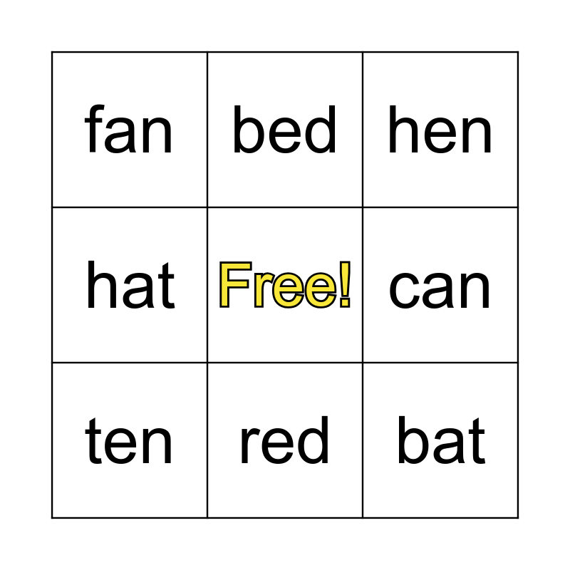 This bingo card has a free space and 11 words: fat, red, bat, ten, bed, hen, can, rat, hat, fan and pen.