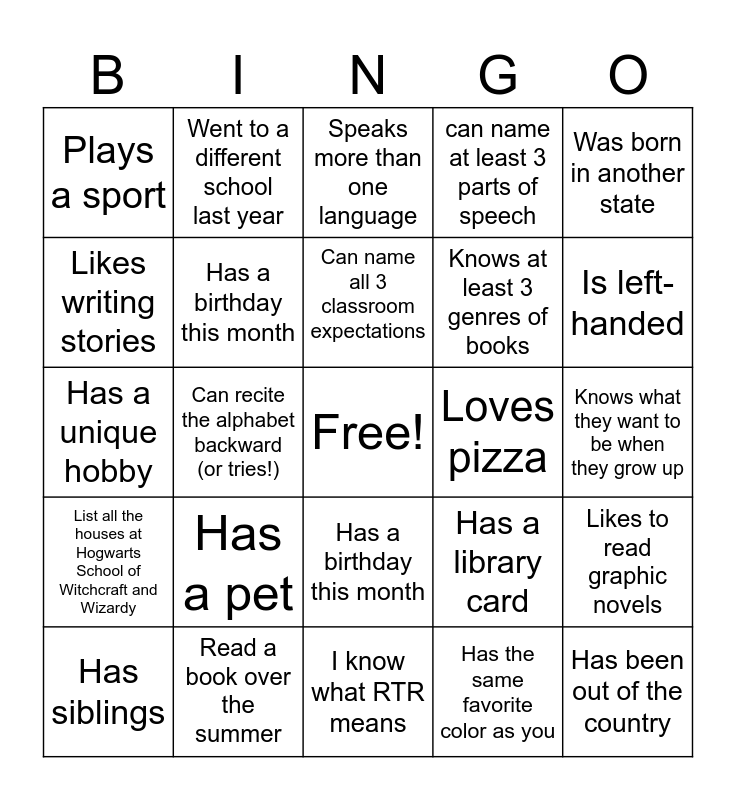 This bingo card has a free space and 24 words: Has a pet, Read a book over the summer, Can name all 3 classroom expectations, Has siblings, Was born in another state, Plays a sport, Likes writing stories, Went to a different school last year, Loves pizza, Has a birthday this month, Knows at least 3 genres of books, Has a unique hobby, Has a library card, Likes to read graphic novels, Has a birthday this month, Has the same favorite color as you, Knows what they want to be when they grow up, Speaks more than one language, Is left-handed, Can recite the alphabet backward (or tries!), Has been out of the country, List all the houses at Hogwarts School of Witchcraft and Wizardy, can name at least 3 parts of speech and I know what RTR means.