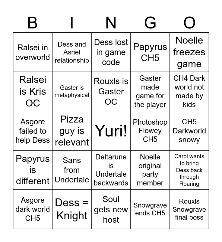 This bingo card has a free space and 24 words: Sans from Undertale, Dess = Knight, Rouxls is Gaster OC, Asgore dark world CH5, Noelle freezes game, Ralsei in overworld, Ralsei is Kris OC, Dess and Asriel relationship, Photoshop Flowey CH5, Deltarune is Undertale backwards, Gaster made game for the player, Asgore failed to help Dess, Noelle original party member, Carol wants to bring Dess back through Roaring, Gaster is metaphysical, Snowgrave ends CH5, CH5 Darkworld snowy, Dess lost in game code, CH4 Dark world not made by kids, Pizza guy is relevant, Rouxls Snowgrave final boss, Papyrus is different, Papyrus CH5 and Soul gets new host.