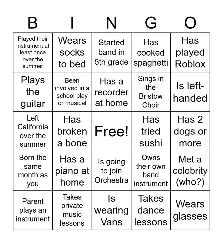 This bingo card has a free space and 24 words: Has a piano at home, Takes private music lessons, Has a recorder at home, Parent plays an instrument, Has played Roblox, Played their instrument at least once over the summer, Plays the guitar, Wears socks to bed, Has tried sushi, Is going to join Orchestra, Sings in the Bristow Choir, Left California over the summer, Owns their own band instrument, Met a celebrity (who?), Been involved in a school play or musical, Takes dance lessons, Has 2 dogs or more, Started band in 5th grade, Is left-handed, Has broken a bone, Wears glasses, Born the same month as you, Has cooked spaghetti and Is wearing Vans.
