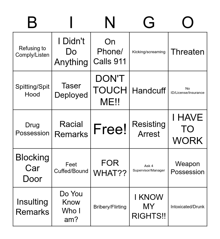 This bingo card has a free space and 26 words: FOR WHAT??, I KNOW MY RIGHTS!!, DON'T TOUCH ME!!, Do You Know Who I am?, Threaten, Refusing to Comply/Listen, Spitting/Spit Hood, I Didn't Do Anything, I HAVE TO WORK, Ask 4 Supervisor/Manager, Handcuff, Drug Possession, Weapon Possession, Insulting Remarks, Racial Remarks, Crying (real/fake), Kicking/screaming, Blocking Car Door, On Phone/ Calls 911, Intoxicated/Drunk, No ID/License/Insurance, Bribery/Flirting, Resisting Arrest, Feet Cuffed/Bound, Taser Deployed and Officer gets Angry.