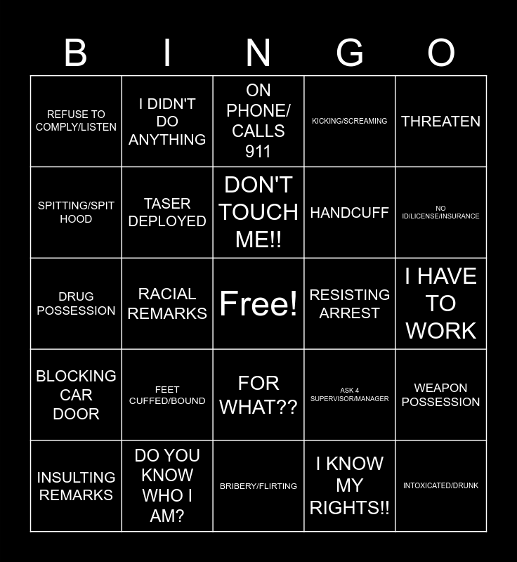 This bingo card has a free space and 26 words: FOR WHAT??, I KNOW MY RIGHTS!!, DON'T TOUCH ME!!, DO YOU KNOW WHO I AM?, THREATEN, REFUSE TO COMPLY/LISTEN, SPITTING/SPIT HOOD, I DIDN'T DO ANYTHING, I HAVE TO WORK, ASK 4 SUPERVISOR/MANAGER, HANDCUFF, DRUG POSSESSION, WEAPON POSSESSION, INSULTING REMARKS, RACIAL REMARKS, CRYING (REAL/FAKE), KICKING/SCREAMING, BLOCKING CAR DOOR, ON PHONE/ CALLS 911, INTOXICATED/DRUNK, NO ID/LICENSE/INSURANCE, BRIBERY/FLIRTING, RESISTING ARREST, FEET CUFFED/BOUND, TASER DEPLOYED and OFFICER GETS ANGRY.