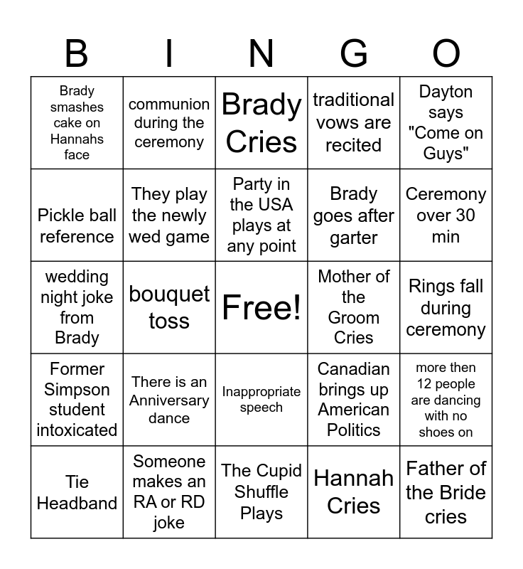 This bingo card has a free space and 29 words: Tie Headband, groomsmen/ bridesmaid pass out in ceremony, bouquet toss, Someone rips their pants on the dance floor, Brady smashes cake on Hannahs face, Brady Cries, They play the newly wed game, There is an Anniversary dance, Mother of the Groom Cries, Someone makes an RA or RD joke, Rings fall during ceremony, Father of the Bride cries, The Cupid Shuffle Plays, Hannah Cries, Ceremony over 30 min, Groomsmen group dance at reception, Inappropriate speech, Former Simpson student intoxicated, Dayton says "Come on Guys", wedding night joke from Brady, Canadian brings up American Politics, Someone takes a whole tray of appetizers, Brady goes after garter, Pickle ball reference, traditional vows are recited, communion during the ceremony, more then 12 people are dancing with no shoes on, Party in the USA plays at any point and there is a polaroid camera for the guest book.