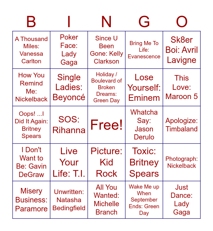 This bingo card has a free space and 75 words: Halo: Beyoncé, Sugar, We're Goin Down: Fall Out Boy, Since U Been Gone: Kelly Clarkson, Get the Party Started: P!NK, Umbrella: Rihanna, No One: Alicia Keys, Dance, Dance: Fall Out Boy, Hips Don't Lie: Shakira, Welcome to the Black Parade: My Chemical Romance, Take A Bow: Rihanna, Crazy In Love: Beyoncé, Breakaway: Kelly Clarkson, Holiday / Boulevard of Broken Dreams: Green Day, How You Remind Me: Nickelback, Mr. Brightside: The Killers, SOS: Rihanna, TiK ToK: Ke$ha, Just Dance: Lady Gaga, She Will Be Loved: Maroon 5, Sk8er Boi: Avril Lavigne, Drops of Jupiter: Train, Oops! ...I Did It Again: Britney Spears, Single Ladies: Beyoncé, Poker Face: Lady Gaga, Bring Me To Life: Evanescence, Yellow: Coldplay, Feel Good Inc.: Gorillaz, Low: Flo Rida, I Gotta Feeling: The Black Eyed Peas, Viva La Vida: Coldplay, The Real Slim Shady: Eminem, Where Is the Love?: The Black Eyed Peas, Ms. Jackson: Outkast, Toxic: Britney Spears, This Love: Maroon 5, Lose Yourself: Eminem, Complicated: Avril Lavigne, What Goes Around...Comes Around: Justin Timberlake, Apologize: Timbaland, Wake Me up When September Ends: Green Day, Disturbia: Rihanna, Fireflies: Owl City, I Kissed A Girl: Katy Perry, Pon de Replay: Rihanna, Whenever, Wherever: Shakira, Hey There Delilah: Plain White T's, Misery Business: Paramore, A Thousand Miles: Vanessa Carlton, Womanizer: Britney Spears, Cry Me a River: Justin Timberlake, Big Girls Don't Cry: Fergie, Picture: Kid Rock, Hollaback Girl: Gwen Stefani, So What: P!NK, Bad Day: Daniel Powter, Before He Cheats: Carrie Underwood, Right Round: Flo Rida, You Belong With Me: Taylor Swift, Glamorous: Fergie, The Sweet Escape: Gwen Stefani, Live Your Life: T.I., Drop It Like It's Hot: Snoop Dogg, I Write Sins Not Tragedies: Panic! At The Disco, Love Story: Taylor Swift, Pocketful of Sunshine: Natasha Bedingfield, Whatcha Say: Jason Derulo, I'm Like A Bird: Nelly Furtado, Love Song: Sara Bareilles, Boom Boom Pow: The Black Eyed Peas, Photograph: Nickelback, I Don't Want to Be: Gavin DeGraw, Unwritten: Natasha Bedingfield, Hey Ya!: Outkast, All You Wanted: Michelle Branch and The Middle: Jimmy Eat World.
