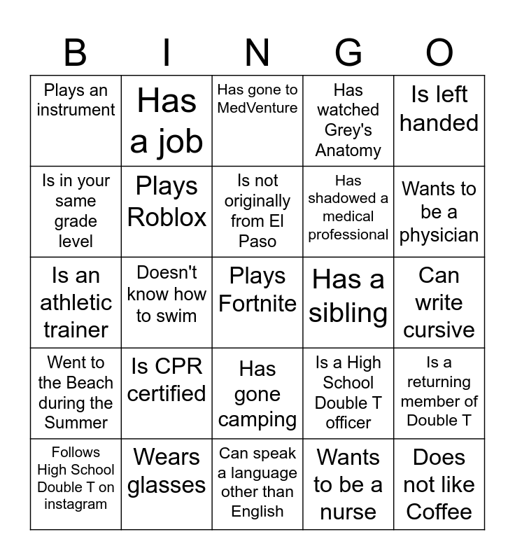 This bingo card has 25 words: Is CPR certified, Can speak a language other than English, Is not originally from El Paso, Follows High School Double T on instagram, Is left handed, Plays an instrument, Is in your same grade level, Has a job, Has a sibling, Has gone camping, Has shadowed a medical professional, Is an athletic trainer, Is a High School Double T officer, Is a returning member of Double T, Plays Roblox, Does not like Coffee, Can write cursive, Has gone to MedVenture, Wants to be a physician, Doesn't know how to swim, Plays Fortnite, Wears glasses, Went to the Beach during the Summer, Has watched Grey's Anatomy and Wants to be a nurse.