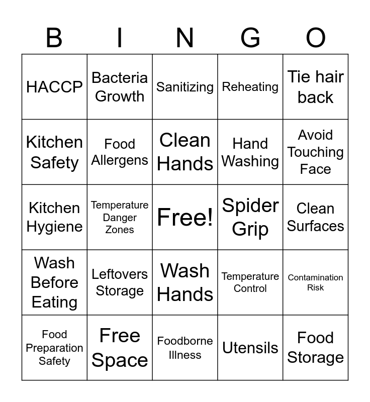 This bingo card has a free space and 30 words: Free Space, Cross-Contamination, Temperature Danger Zones, Personal Hygiene, HACCP, Sanitizing, Food Allergens, Wash Hands, Spider Grip, Foodborne Illness, Clean Surfaces, Food Storage, Utensils, Allergy, Avoid Touching Face, Wearing apron, Temperature Control, Wash Before Eating, Leftovers Storage, Tie hair back, Kitchen Hygiene, Avoid Contaminants, Bacteria Growth, Hand Washing, Kitchen Safety, Reheating, Contamination Risk, Food Preparation Safety, Clean Hands and Store Leftovers.