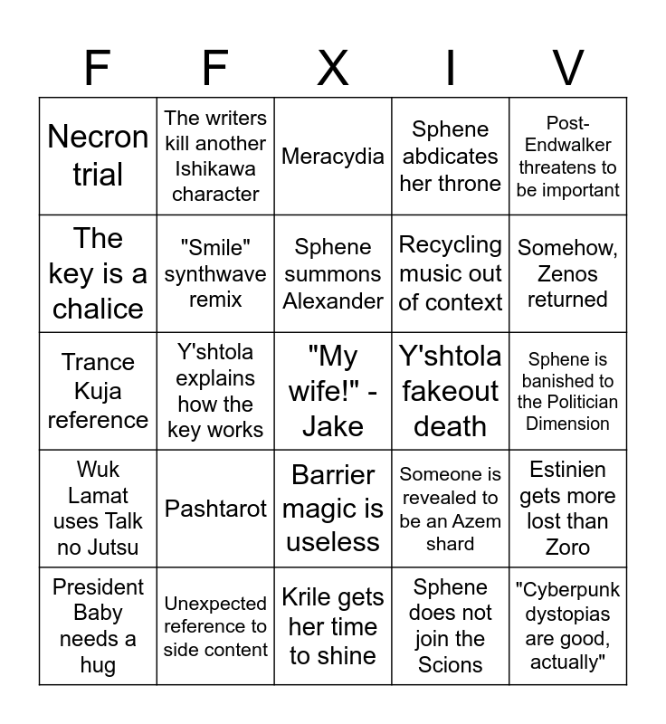This bingo card has a free space and 24 words: Pashtarot, Unexpected reference to side content, Sphene summons Alexander, President Baby needs a hug, Post-Endwalker threatens to be important, Necron trial, The key is a chalice, The writers kill another Ishikawa character, Y'shtola fakeout death, Barrier magic is useless, Recycling music out of context, Trance Kuja reference, Someone is revealed to be an Azem shard, Estinien gets more lost than Zoro, "Smile" synthwave remix, Sphene does not join the Scions, Sphene is banished to the Politician Dimension, Meracydia, Somehow, Zenos returned, Y'shtola explains how the key works, "Cyberpunk dystopias are good, actually", Wuk Lamat uses Talk no Jutsu, Sphene abdicates her throne and Krile gets her time to shine.