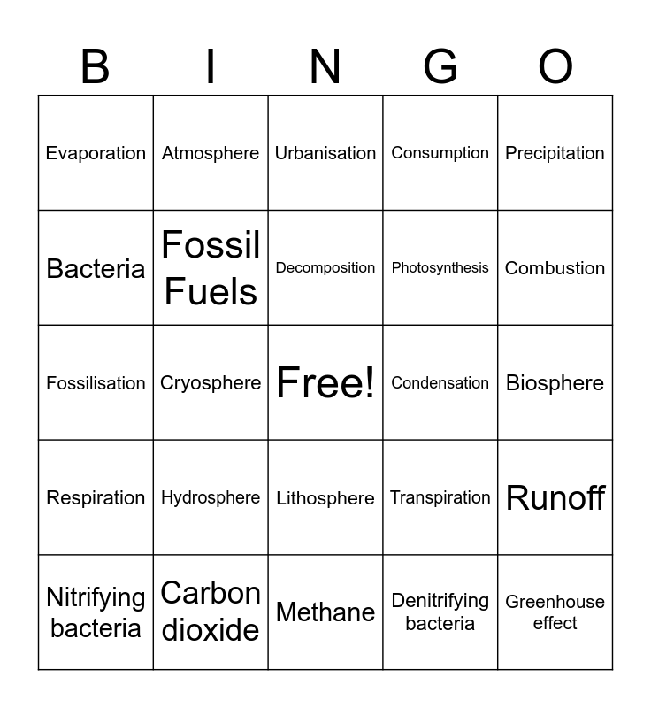 This bingo card has a free space and 24 words: Hydrosphere, Carbon dioxide, Decomposition, Nitrifying bacteria, Precipitation, Evaporation, Bacteria, Atmosphere, Condensation, Lithosphere, Photosynthesis, Fossilisation, Transpiration, Runoff, Fossil Fuels, Denitrifying bacteria, Biosphere, Urbanisation, Combustion, Cryosphere, Greenhouse effect, Respiration, Consumption and Methane.