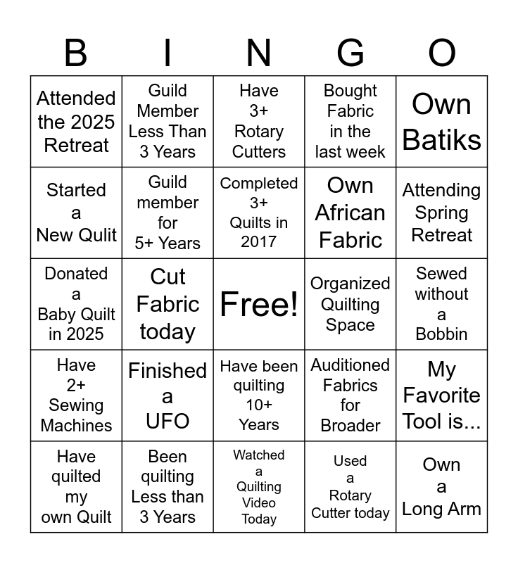 This bingo card has a free space and 24 words: Finished a UFO, Been quilting Less than 3 Years, Completed 3+ Quilts in 2017, Have quilted my own Quilt, Own Batiks, Attended the 2025 Retreat, Started a New Qulit, Guild Member Less Than 3 Years, Organized Quilting Space, Have been quilting 10+ Years, Own African Fabric, Donated a Baby Quilt in 2025, Auditioned Fabrics for Broader, My Favorite Tool is..., Guild member for 5+ Years, Used a Rotary Cutter today, Sewed without a Bobbin, Have 3+ Rotary Cutters, Attending Spring Retreat, Cut Fabric today, Own a Long Arm, Have 2+ Sewing Machines, Bought Fabric in the last week and Watched a Quilting Video Today.