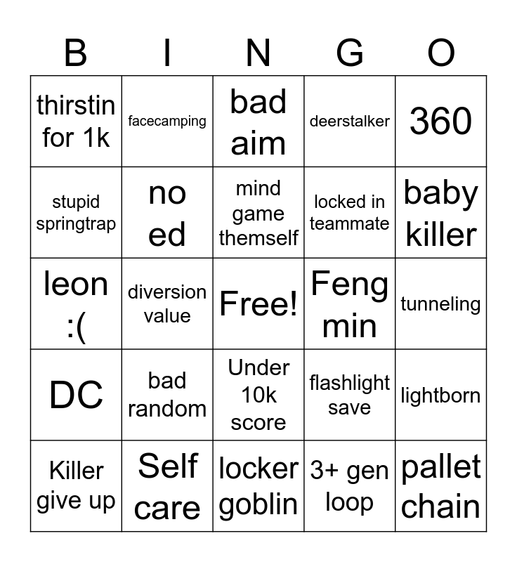 This bingo card has a free space and 24 words: bad random, Self care, mind game themself, Killer give up, 360, thirstin for 1k, stupid springtrap, facecamping, Feng min, Under 10k score, locked in teammate, leon :(, flashlight save, lightborn, no ed, 3+ gen loop, tunneling, bad aim, baby killer, diversion value, pallet chain, DC, deerstalker and locker goblin.