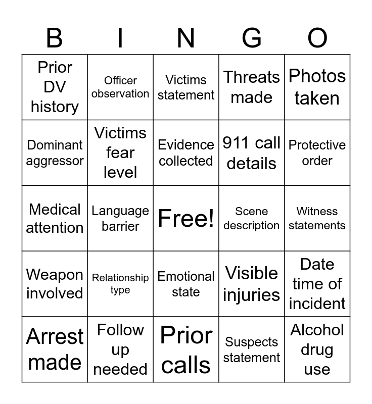 This bingo card has a free space and 24 words: Relationship type, Follow up needed, Evidence collected, Arrest made, Photos taken, Prior DV history, Dominant aggressor, Officer observation, Scene description, Emotional state, 911 call details, Medical attention, Visible injuries, Date time of incident, Victims fear level, Suspects statement, Witness statements, Victims statement, Protective order, Language barrier, Alcohol drug use, Weapon involved, Threats made and Prior calls.