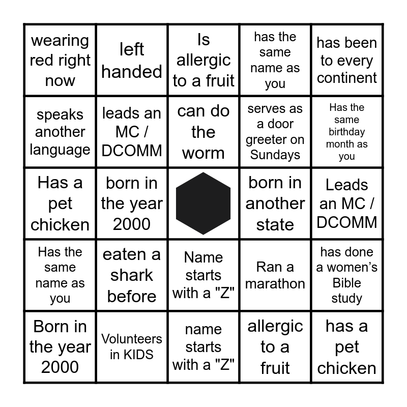 This bingo card has 1 images, a free space and 48 words: has the same birthday month as you, has a pet chicken, been a partner for 10+ years, name starts with a "Z", eaten a shark before, sings in the choir, left handed, volunteers in KIDS, speaks another language, has gone to men’s retreat, leads an MC / DCOMM, has the same name as you, has done a women’s Bible study, Ran a marathon, lives in dripping springs, been on a mission trip, can do the worm, born in another state, 1st time at a partner gathering, has been to every continent, born in the year 2000, allergic to a fruit, wearing red right now, serves as a door greeter on Sundays, Has gone to men’s retreat, Has the same birthday month as you, Born in the year 2000, Partner for over 10+ years, Name starts with a "Z", Has the same name as you, Eaten a shark before, Been on a mission trip, Sings in the choir, Born in another state, Volunteers in KIDS, Speaks another language, Has done a women’s Bible study, Leads an MC / DCOMM, Lives in dripping springs, 1st time at a partner gathering, Left handed, Can do the worm, Has been to every continent, Has a pet chicken, Is allergic to a fruit, Wearing red right now, Serves as a door greeter on Sundays and Ran a marathon.