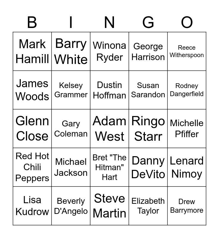 This bingo card has a free space and 24 words: Michael Jackson, Beverly D'Angelo, Dustin Hoffman, Lisa Kudrow, Reece Witherspoon, Mark Hamill, James Woods, Barry White, Ringo Starr, Bret "The Hitman" Hart, Susan Sarandon, Glenn Close, Danny DeVito, Lenard Nimoy, Kelsey Grammer, Elizabeth Taylor, Michelle Pfiffer, Winona Ryder, Rodney Dangerfield, Gary Coleman, Drew Barrymore, Red Hot Chili Peppers, George Harrison and Steve Martin.