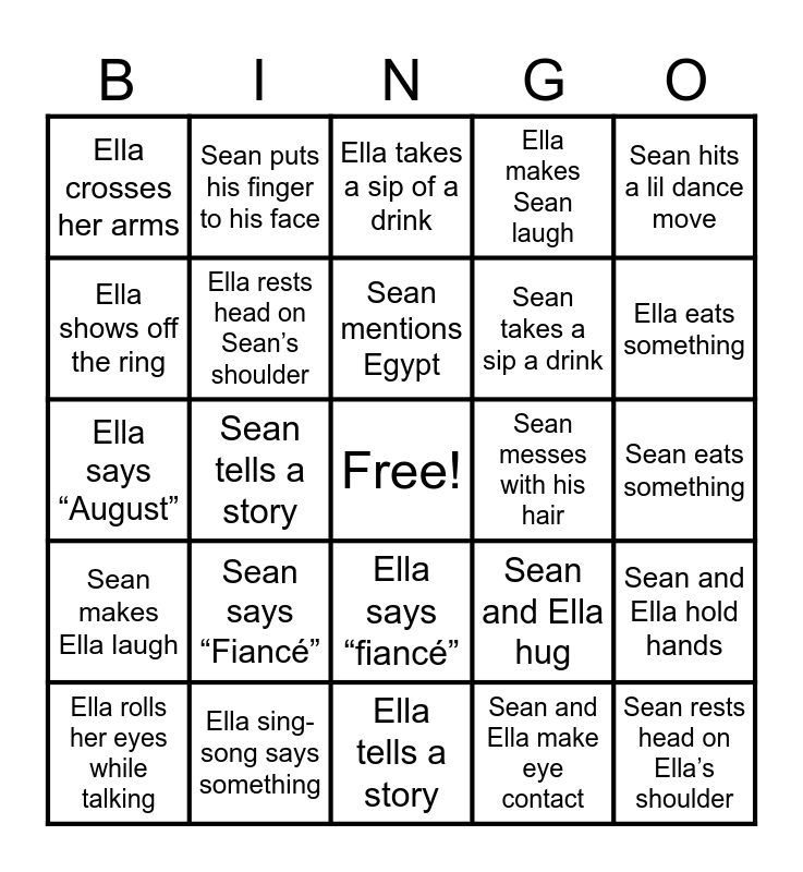 This bingo card has a free space and 24 words: Sean says “Fiancé”, Ella sing-song says something, Sean mentions Egypt, Ella rolls her eyes while talking, Sean hits a lil dance move, Ella crosses her arms, Ella shows off the ring, Sean puts his finger to his face, Sean messes with his hair, Ella says “fiancé”, Sean takes a sip a drink, Ella says “August”, Sean and Ella hug, Sean and Ella hold hands, Ella rests head on Sean’s shoulder, Sean and Ella make eye contact, Sean eats something, Ella takes a sip of a drink, Ella eats something, Sean tells a story, Sean rests head on Ella’s shoulder, Sean makes Ella laugh, Ella makes Sean laugh and Ella tells a story.