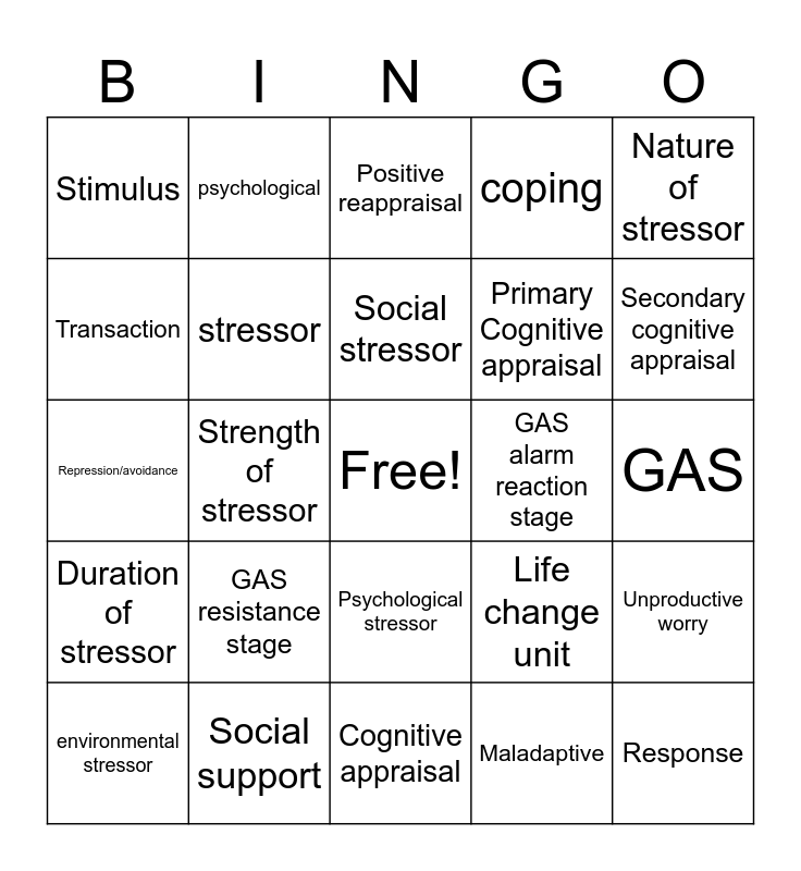 This bingo card has a free space and 39 words: stress, distress, eustress, stressor, environmental stressor, Psychological stressor, Social stressor, Cultural stressor, Nature of stressor, Duration of stressor, Strength of stressor, coping, Response, GAS, GAS alarm reaction stage, GAS resistance stage, GAS exhaustion stage, Stimulus, Social readjustment scale, Life change unit, Transaction, Cognitive appraisal, Primary Cognitive appraisal, Secondary cognitive appraisal, Reappraisal, Coping strategies, Problem focused coping, Emotion focused coping, physiological, psychological, Adaptive, Adaptive strategies, Positive reappraisal, Social support, Maladaptive, Maladaptive strategies, Unproductive worry, Repression/avoidance and Aggression/blame.