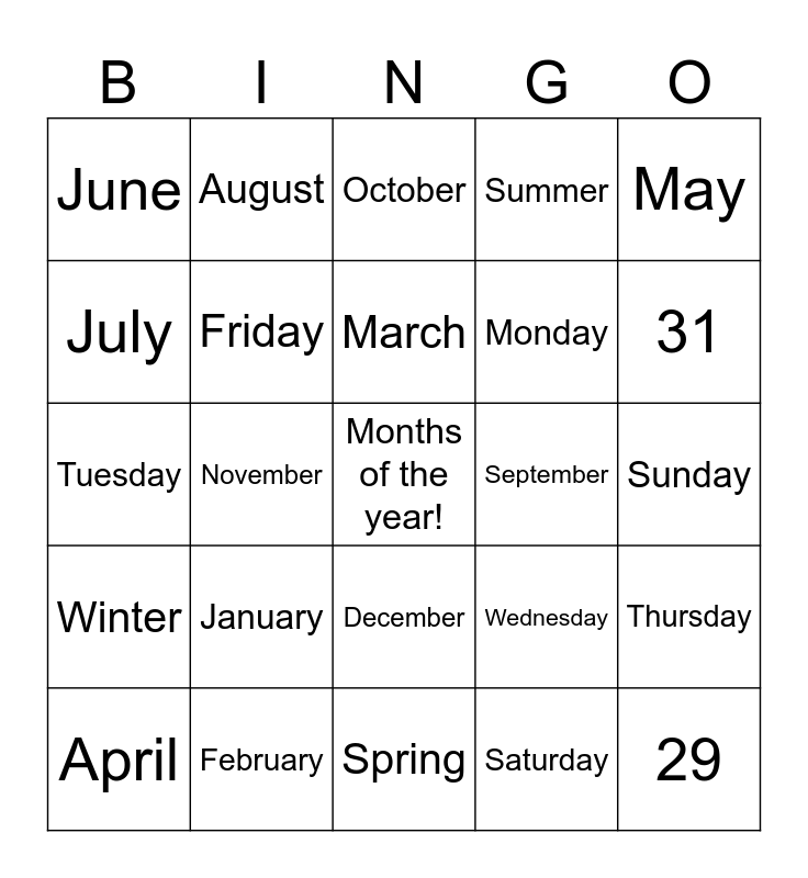 This bingo card has a free space and 24 words: January, February, March, April, May, June, July, August, September, December, Monday, Tuesday, Wednesday, Thursday, Friday, Saturday, Sunday, October, 31, November, 29, Winter, Summer and Spring.