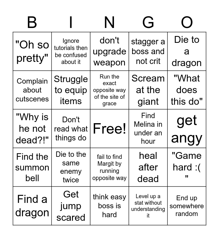 This bingo card has a free space and 24 words: Die to the same enemy twice, Get jump scared, Run the exact opposite way of the site of grace, Find a dragon, Die to a dragon, "Oh so pretty", Complain about cutscenes, Ignore tutorials then be confused about it, Find Melina in under an hour, fail to find Margit by running opposite way, Scream at the giant, "Why is he not dead?!", heal after dead, "Game hard :( ", Struggle to equip items, Level up a stat without understanding it, get angy, don't upgrade weapon, "What does this do", Don't read what things do, End up somewhere random, Find the summon bell, stagger a boss and not crit and think easy boss is hard.