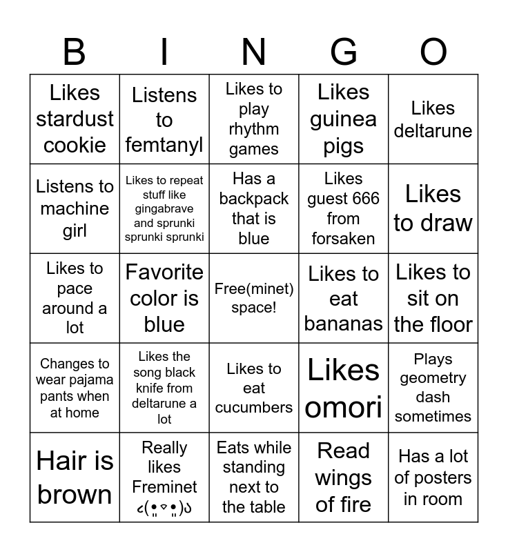 This bingo card has a free space and 24 words: Likes the song black knife from deltarune a lot, Really likes Freminet ૮(•͈⌔•͈)ა, Has a backpack that is blue, Hair is brown, Likes deltarune, Likes stardust cookie, Listens to machine girl, Listens to femtanyl, Likes to eat bananas, Likes to eat cucumbers, Likes guest 666 from forsaken, Likes to pace around a lot, Likes omori, Plays geometry dash sometimes, Likes to repeat stuff like gingabrave and sprunki sprunki sprunki, Read wings of fire, Likes to sit on the floor, Likes to play rhythm games, Likes to draw, Favorite color is blue, Has a lot of posters in room, Changes to wear pajama pants when at home, Likes guinea pigs and Eats while standing next to the table.