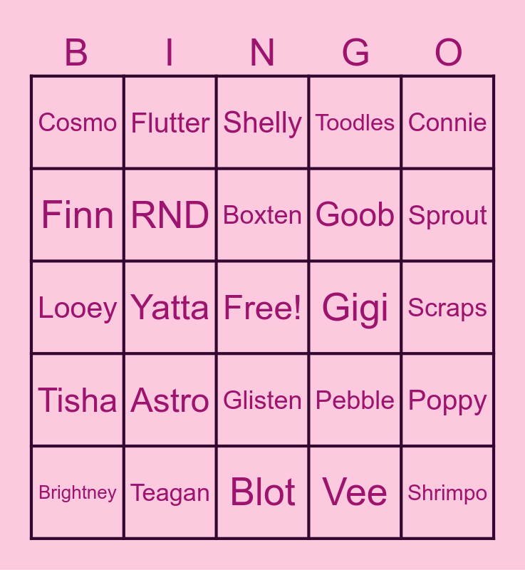 This bingo card has a free space and 25 words: Astro, Blot, Boxten, Brightney, Connie, Cosmo, Finn, Flutter, Gigi, Glisten, Goob, Looey, Pebble, Poppy, RND, Rodger, Scraps, Shelly, Sprout, Yatta, Shrimpo, Teagan, Tisha, Toodles and Vee.