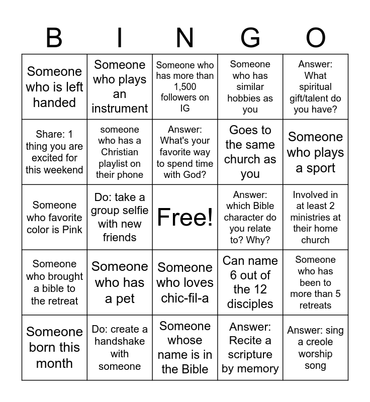 This bingo card has a free space and 39 words: Someone getting baptized this year, 1st time at the retreat, Answer: one prayer that God has answered for you?, someone who has a Christian playlist on their phone, Someone born this month, Someone who loves chic-fil-a, Answer: What's your favorite way to spend time with God?, Someone who has more than 2 siblings, Answer: What spiritual gift/talent do you have?, Someone who brought a bible to the retreat, Do: take a group selfie with new friends, Someone who has similar hobbies as you, Answer: sing a creole worship song, Involved in at least 2 ministries at their home church, Answer: which Bible character do you relate to? Why?, Someone who has a pet, Do: Create a hashtag for a bible character, Someone who is left handed, Someone who's favorite color is green, Can name 6 out of the 12 disciples, Share: 1 thing you are excited for this weekend, Someone whose name is in the Bible, Goes to the same church as you, Someone who plays a sport, Answer: Sing a worship song, Answer: What is a worship song that speaks to you?, Do: Create a hashtag for a bible character, Someone who was nervous to attend the retreat, Someone who is part of the worship team, Someone who plays an instrument, Someone who has 1000+ pictures in their phone, Someone who has a viral tiktok video, Someone who has more than 1,500 followers on IG, Do: create a handshake with someone, Answer: Recite a scripture by memory, Do: Take a selfie with a Pastor, Someone who has been to more than 5 retreats, Someone who favorite color is Pink and Do: Pray with someone new.