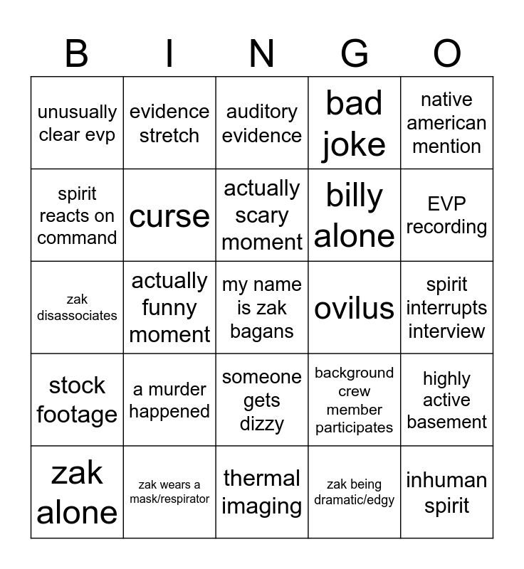 This bingo card has a free space and 71 words: unnecessary replay, evidence stretch, spirit box, SLS camera, thermal imaging, long pauses, bad joke, jay alone, billy alone, aaron alone, zak alone, emf reading, EVP recording, unusually clear evp, awkward interview, zak disassociates, background crew member participates, native american mention, creepy little girl, spirit interrupts interview, a murder happened, inhuman spirit, highly active basement, highly active attic, evidence debunked, zak is an asshole, argument, trigger objects, jesus christ mention, poltergeist activity, zak wears a mask/respirator, someone gets hurt by a spirit, shitty evp, interviewee cries, zak being dramatic/edgy, interview an employee, [beep] [beep] [beep] [beep], shadow figure, spirit reacts on command, visual anomaly, someone gets dizzy, drone shot, stock footage, dumb sound effects, paranormal puck, old person interview, tuberculosis mention, curse, satan mention, abandoned building, outdoor investigation, zak does something dumb, ovilus, never seen before, suicide, gibberish, actually scary moment, YUCKY, zak taunts a demon, multiple family members die, jay stuck at nerve forever, aaron does something goofy, actually funny moment, trifield meter, temperature change, new or unusual tool, auditory evidence, zak actually funny, chest pains, unnecessary/over the top recreation and polaroids.