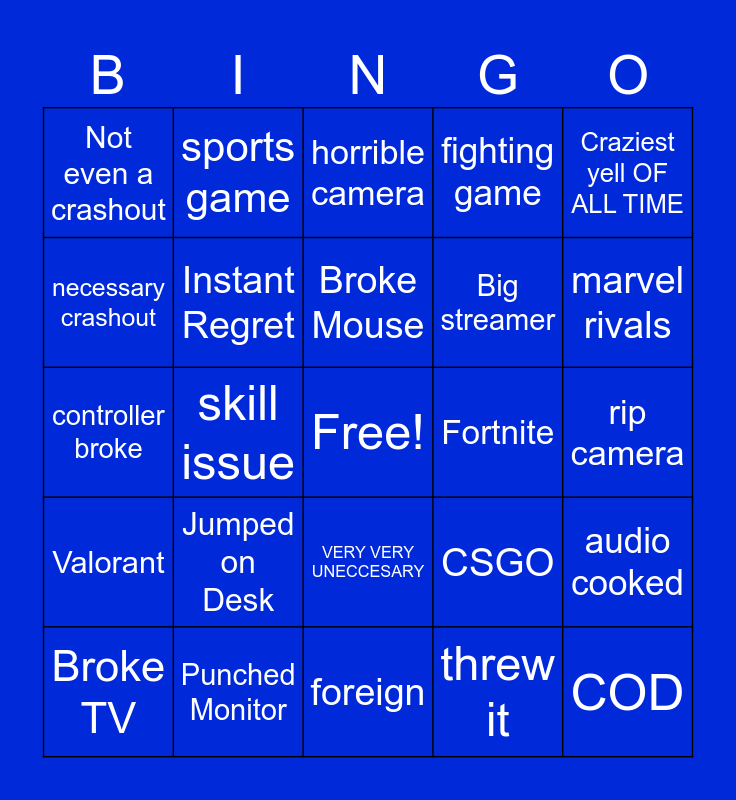 This bingo card has a free space and 24 words: Jumped on Desk, Punched Monitor, Broke Mouse, Broke TV, Craziest yell OF ALL TIME, Not even a crashout, necessary crashout, sports game, Fortnite, VERY VERY UNECCESARY, Big streamer, controller broke, CSGO, audio cooked, Instant Regret, threw it, rip camera, horrible camera, marvel rivals, skill issue, COD, Valorant, fighting game and foreign.