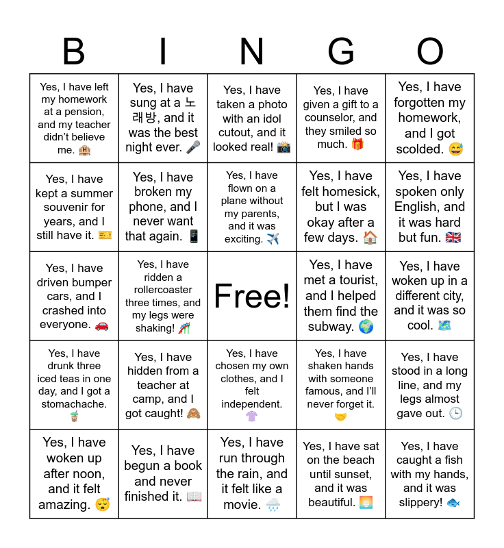 This bingo card has a free space and 33 words: Yes, I have gone to Everland, and I would love to go again! π‘, Yes, I have eaten mango bingsu, and I still dream about it. π§, Yes, I have ridden a rollercoaster three times, and my legs were shaking! π’, Yes, I have swum in the ocean, and it was super fun. π, Yes, I have drunk three iced teas in one day, and I got a stomachache. π§, Yes, I have broken my phone, and I never want that again. π±, Yes, I have forgotten my homework, and I got scolded. π , Yes, I have woken up after noon, and it felt amazing. π΄, Yes, I have sung at a λ Έλλ°©, and it was the best night ever. π€, Yes, I have drawn a comic, and my friends loved it. βοΈ, Yes, I have flown on a plane without my parents, and it was exciting. βοΈ, Yes, I have taken a photo with an idol cutout, and it looked real! πΈ, Yes, I have written a diary, and it helped me remember everything. π, Yes, I have lost my wallet, and it was really scary. π, Yes, I have met a tourist, and I helped them find the subway. π, Yes, I have spoken only English, and it was hard but fun. π¬π§, Yes, I have begun a book and never finished it. π, Yes, I have driven bumper cars, and I crashed into everyone. π, Yes, I have hidden from a teacher at camp, and I got caught! π, Yes, I have shaken hands with someone famous, and Iβll never forget it. π€, Yes, I have chosen my own clothes, and I felt independent. π, Yes, I have worn matching outfits, and we looked so cute. π―, Yes, I have left my homework at a pension, and my teacher didnβt believe me. π¨, Yes, I have woken up in a different city, and it was so cool. πΊοΈ, Yes, I have run through the rain, and it felt like a movie. π§οΈ, Yes, I have caught a fish with my hands, and it was slippery! π, Yes, I have given a gift to a counselor, and they smiled so much. π, Yes, I have felt homesick, but I was okay after a few days. π , Yes, I have kept a summer souvenir for years, and I still have it. π«, Yes, I have stood in a long line, and my legs almost gave out. π, Yes, I have found money on the ground, and I bought ice cream. π°, Yes, I have sat on the beach until sunset, and it was beautiful. π and Yes, I have made friends from another country, and we still message. π.