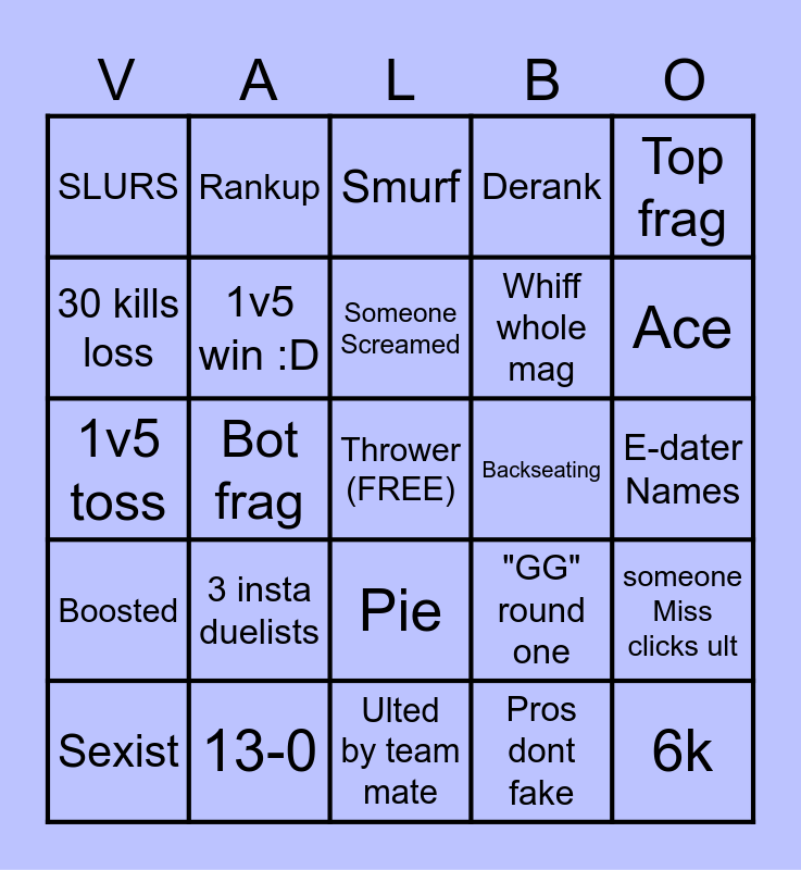 This bingo card has a free space and 29 words: Sexist, 20+ assists, Bot frag, ff 3x, SLURS, Smurf, 1v5 win :D, 3 insta duelists, Backseating, 13-0, E-dater Names, 6k, Ulted by team mate, Pros dont fake, Ace, Knife kill, Pie, Boosted, Top frag, 1v5 toss, "GG" round one, OT, Whiff whole mag, 30 kills loss, Derank, Rankup, someone Miss clicks ult, Someone Screamed and Child.