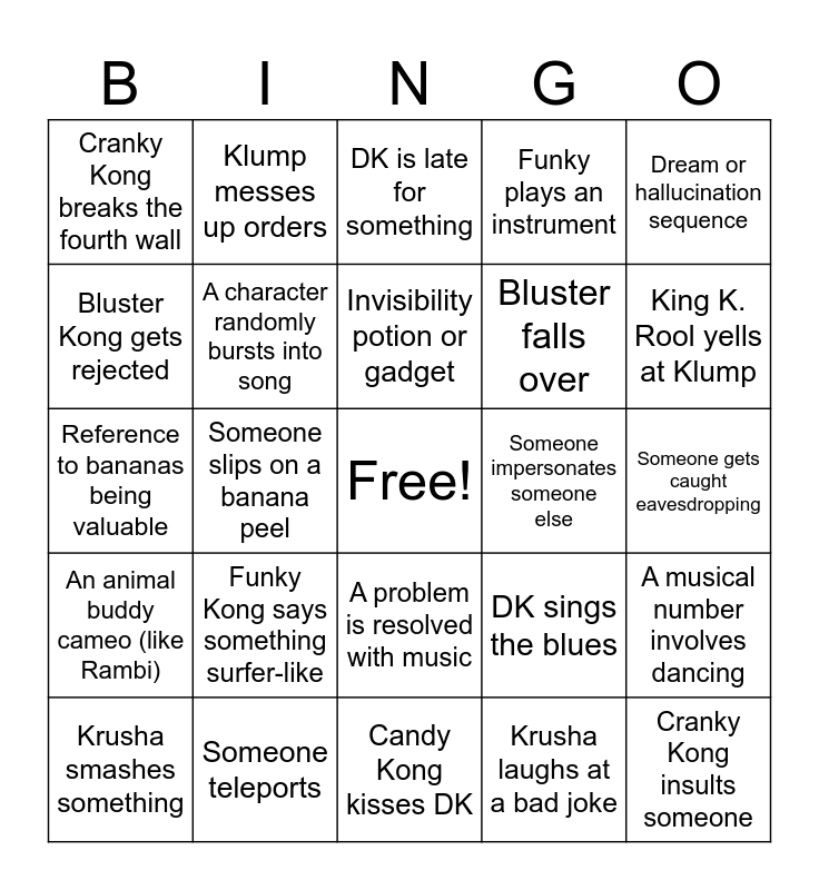 This bingo card has a free space and 50 words: Donkey Kong says “Banana”, Cranky Kong insults someone, Diddy Kong does a flip, Candy Kong kisses DK, Funky Kong says something surfer-like, King K. Rool monologues, Klump messes up orders, Krusha says something dumb, Bluster Kong gets rejected, Dixie Kong shows up, A character randomly bursts into song, Funky plays an instrument, A musical number involves dancing, DK sings the blues, The background music sounds suspiciously like jungle beats, Someone loses the Crystal Coconut, Invisibility potion or gadget, Someone impersonates someone else, There's a treasure hunt, Dream or hallucination sequence, Someone slips on a banana peel, Krusha laughs at a bad joke, Cranky Kong breaks the fourth wall, Bluster falls over, Diddy makes a sarcastic remark, Crystal Coconut glows, King K. Rool yells at Klump, Someone says "Donkey Kong!" in distress, DK is late for something, A problem is resolved with music, Magic or potion causes chaos, Someone turns into another creature, Mind control occurs, DK randomly becomes a genius, Someone teleports, Candy breaks up with DK, DK gets jealous, Bluster makes a move on Candy, DK tries to apologize, Someone gets caught eavesdropping, Mine cart or barrel chase, A trap is sprung, King K. Rool sends out robots, A fight breaks out (with slapstick), Krusha smashes something, Reference to bananas being valuable, Funky’s plane or barrel-blaster crashes, Someone eats too much, An animal buddy cameo (like Rambi) and A character says something that sounds like it came from a video game.