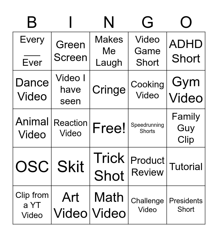 This bingo card has a free space and 24 words: Skit, Art Video, Cringe, Clip from a YT Video, ADHD Short, Every ___ Ever, Dance Video, Green Screen, Speedrunning Shorts, Trick Shot, Cooking Video, Animal Video, Product Review, Tutorial, Video I have seen, Challenge Video, Family Guy Clip, Makes Me Laugh, Gym Video, Reaction Video, Presidents Short, OSC, Video Game Short and Math Video.