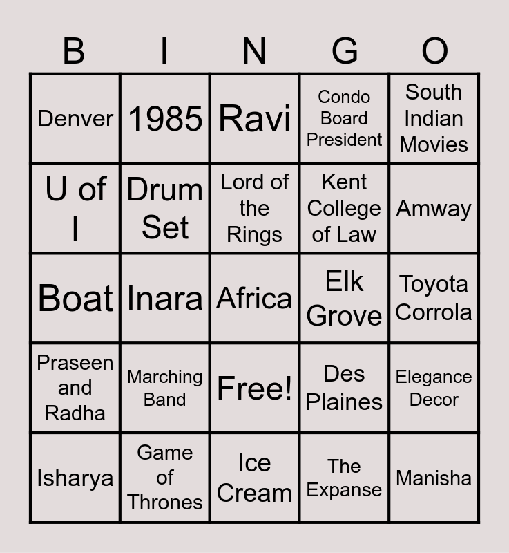 This bingo card has 26 words: Free!, The Expanse, Lord of the Rings, Game of Thrones, South Indian Movies, Denver, U of I, 1985, Toyota Corrola, Des Plaines, Kent College of Law, Boat, Elegance Decor, Isharya, Inara, Kian, Condo Board President, Praseen and Radha, Ravi, Africa, Amway, Ice Cream, Elk Grove, Marching Band, Drum Set and Manisha.