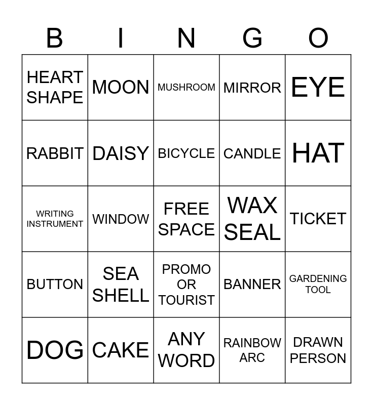 This bingo card has a free space and 24 words: SEA SHELL, CAKE, BICYCLE, DOG, EYE, HEART SHAPE, RABBIT, MOON, WAX SEAL, PROMO OR TOURIST, CANDLE, WRITING INSTRUMENT, BANNER, GARDENING TOOL, DAISY, RAINBOW ARC, TICKET, MUSHROOM, HAT, WINDOW, DRAWN PERSON, BUTTON, MIRROR and ANY WORD.