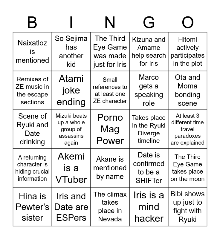 This bingo card has a free space and 24 words: Akemi is a VTuber, Iris and Date are ESPers, Small references to at least one ZE character, Hina is Pewter's sister, Hitomi actively participates in the plot, Naixatloz is mentioned, Remixes of ZE music in the escape sections, So Sejima has another kid, Takes place in the Ryuki Diverge timeline, Akane is mentioned by name, Marco gets a speaking role, Scene of Ryuki and Date drinking, Date is confirmed to be a SHIFTer, The Third Eye Game takes place on the moon, Atami joke ending, Iris is a mind hacker, At least 3 different time travel paradoxes are explained, The Third Eye Game was made just for Iris, Ota and Moma bonding scene, Mizuki beats up a whole group of assassins again, Bibi shows up just to fight with Ryuki, A returning character is hiding crucial information, Kizuna and Amame help search for Iris and The climax takes place in Nevada.