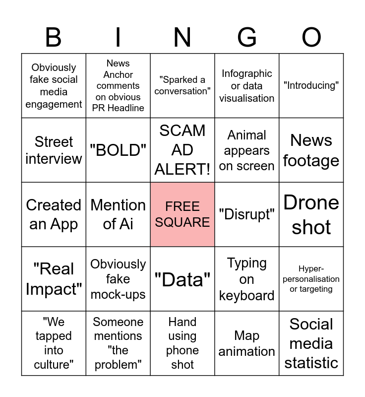 This bingo card has a free space and 29 words: "We tapped into culture", Impressions, Mention of Ai, “We redefined 'X' category.”, Obviously fake social media engagement, "Sparked a conversation", "BOLD", Obviously fake mock-ups, "Disrupt", Someone mentions "the problem", Drone shot, Social media statistic, Hand using phone shot, Map animation, News footage, Product Shot, "Data", "Real Impact", "Introducing", Created an App, Typing on keyboard, Media spend mentioned, Animal appears on screen, Street interview, Infographic or data visualisation, News Anchor comments on obvious PR Headline, Hyper-personalisation or targeting, SCAM AD ALERT! and Jaunty library music.