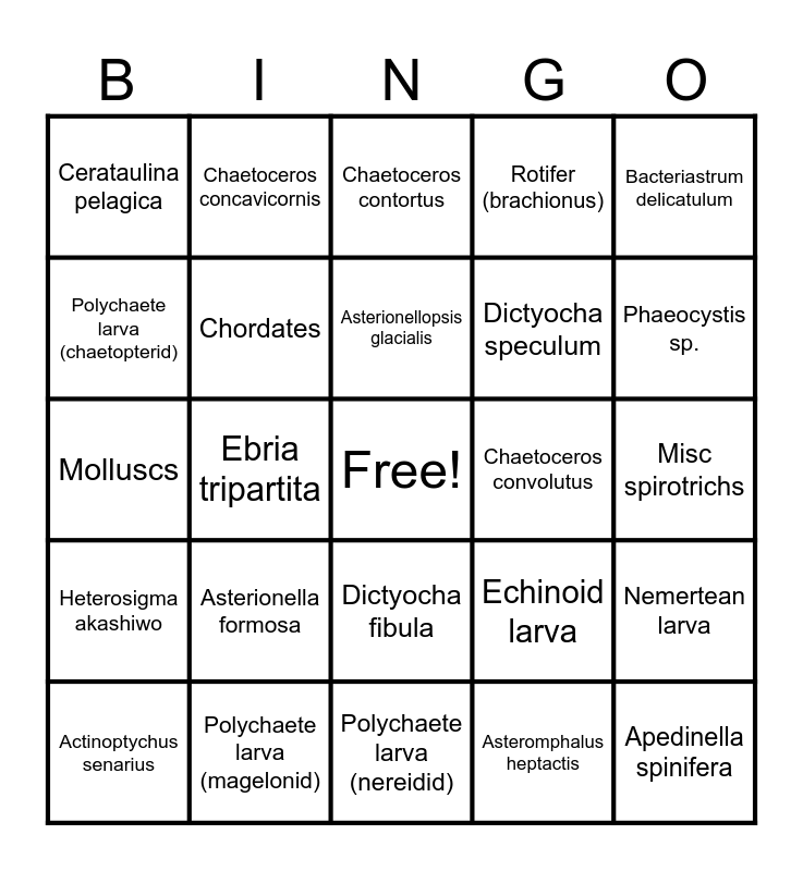 This bingo card has a free space and 24 words: Actinoptychus senarius, Asterionella formosa, Asterionellopsis glacialis, Asteromphalus heptactis, Bacteriastrum delicatulum, Cerataulina pelagica, Chaetoceros concavicornis, Chaetoceros contortus, Chaetoceros convolutus, Misc spirotrichs, Molluscs, Chordates, Echinoid larva, Nemertean larva, Polychaete larva (chaetopterid), Polychaete larva (magelonid), Polychaete larva (nereidid), Rotifer (brachionus), Phaeocystis sp., Heterosigma akashiwo, Ebria tripartita, Dictyocha fibula, Dictyocha speculum and Apedinella spinifera.