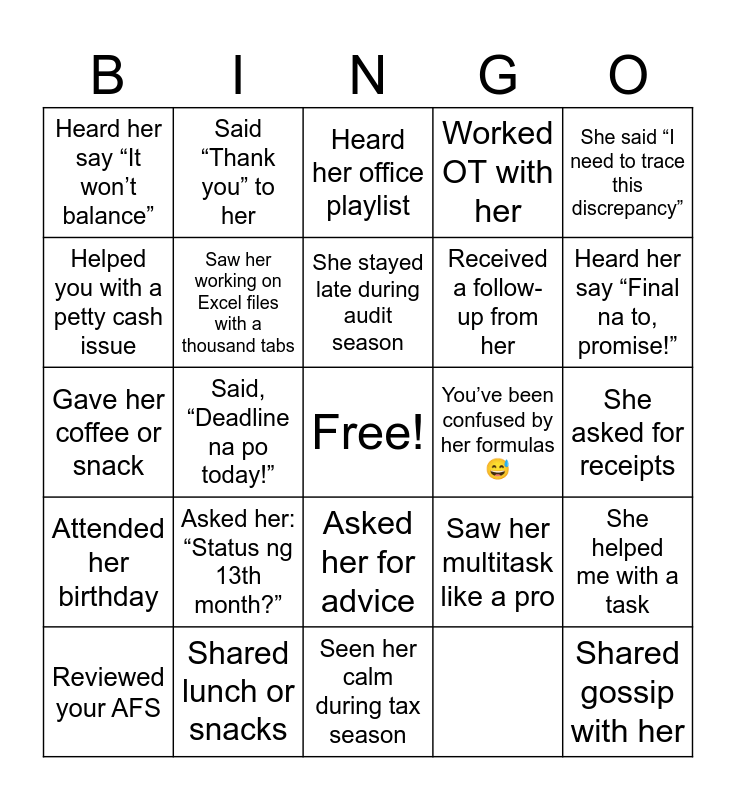 This bingo card has a free space and 26 words: Reviewed your AFS, Asked her for budget clarification, She asked for receipts, Said, “Deadline na po today!”, Received a follow-up from her, Heard her say “It won’t balance”, She stayed late during audit season, She said “I need to trace this discrepancy”, Saw her working on Excel files with a thousand tabs, You’ve been confused by her formulas 😅, Helped you with a petty cash issue, Seen her calm during tax season, Cried laughing with her, Joined a Zoom with her, She helped me with a task, Shared lunch or snacks, Worked OT with her, Attended her birthday, Heard her office playlist, Shared gossip with her, Said “Thank you” to her, Saw her multitask like a pro, Gave her coffee or snack, Asked her for advice, Heard her say “Final na to, promise!” and Asked her: “Status ng 13th month?”.