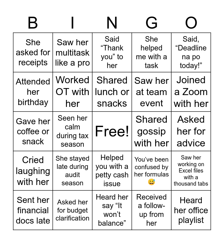 This bingo card has a free space and 26 words: Cried laughing with her, Reviewed your AFS, Joined a Zoom with her, Asked her for budget clarification, She helped me with a task, She asked for receipts, Shared lunch or snacks, Said, “Deadline na po today!”, Worked OT with her, Received a follow-up from her, Attended her birthday, Heard her say “It won’t balance”, Heard her office playlist, She stayed late during audit season, Shared gossip with her, She said “I need to trace this discrepancy”, Said “Thank you” to her, Saw her working on Excel files with a thousand tabs, Saw her multitask like a pro, You’ve been confused by her formulas 😅, Gave her coffee or snack, Helped you with a petty cash issue, Asked her for advice, Seen her calm during tax season, Saw her at team event and Sent her financial docs late.