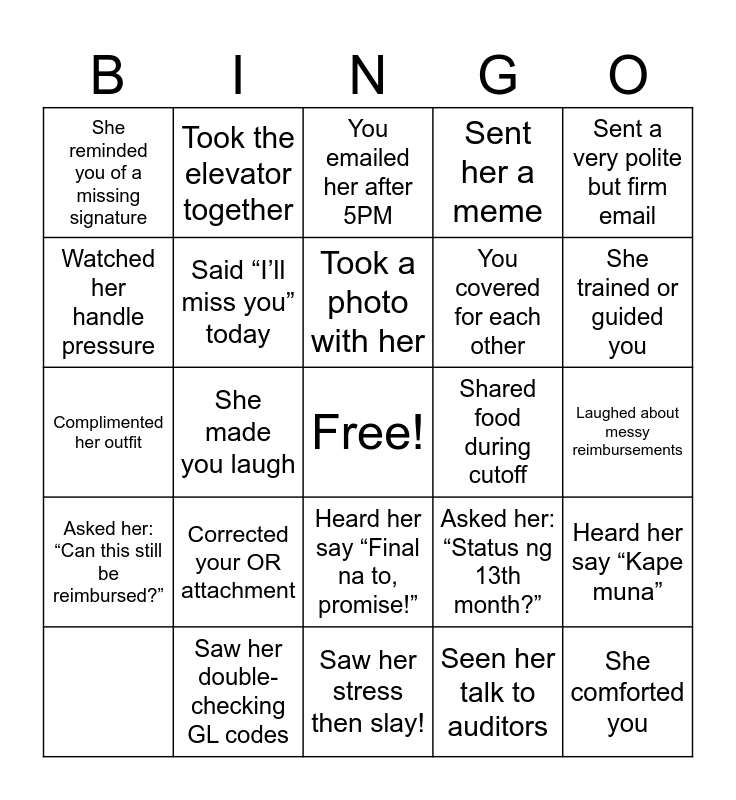 This bingo card has a free space and 26 words: Complimented her outfit, She said “I’ll just reconcile it tomorrow”, She trained or guided you, Saw her double-checking GL codes, Sent her a meme, She reminded you of a missing signature, Took a photo with her, Sent a very polite but firm email, She made you laugh, Seen her talk to auditors, Watched her handle pressure, Heard her say “Final na to, promise!”, She comforted you, Corrected your OR attachment, You covered for each other, Asked her: “Can this still be reimbursed?”, You emailed her after 5PM, Heard her say “Kape muna”, Took the elevator together, Shared food during cutoff, Said “I’ll miss you” today, Nakasama mag inom or bar, Laughed about messy reimbursements, Asked her: “Status ng 13th month?”, Saw her stress then slay! and Cried laughing with her.