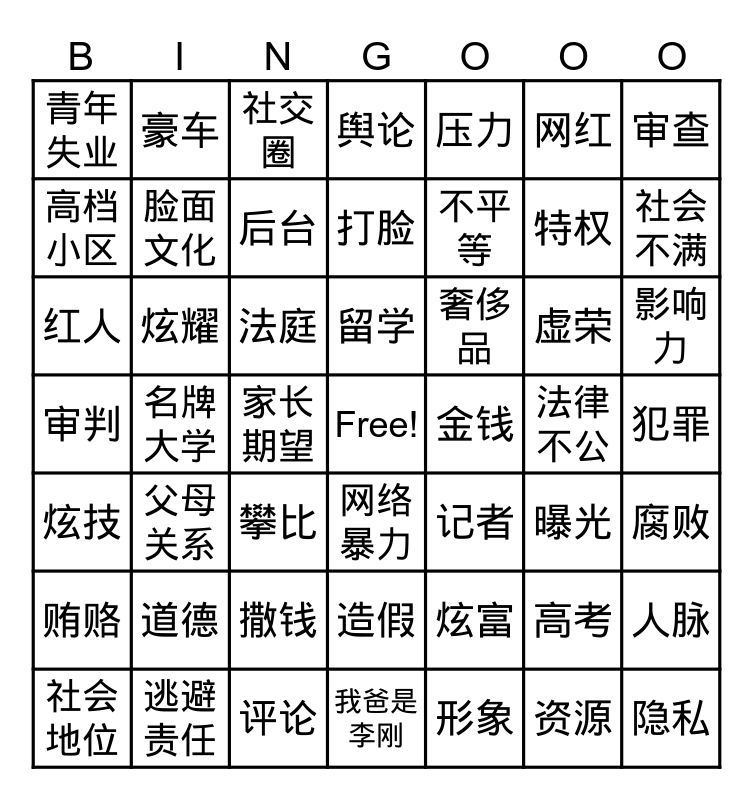 This bingo card has a free space and 48 words: 炫富, 特权, 我爸是李刚, 名牌大学, 法庭, 犯罪, 豪车, 逃避责任, 网红, 网络暴力, 审查, 舆论, 虚荣, 奢侈品, 贿赂, 法律不公, 高档小区, 社会不满, 高考, 压力, 不平等, 家长期望, 青年失业, 脸面文化, 人脉, 后台, 影响力, 社会地位, 留学, 炫耀, 资源, 金钱, 腐败, 道德, 审判, 记者, 曝光, 红人, 攀比, 撒钱, 炫技, 隐私, 社交圈, 评论, 打脸, 造假, 父母关系 and 形象.