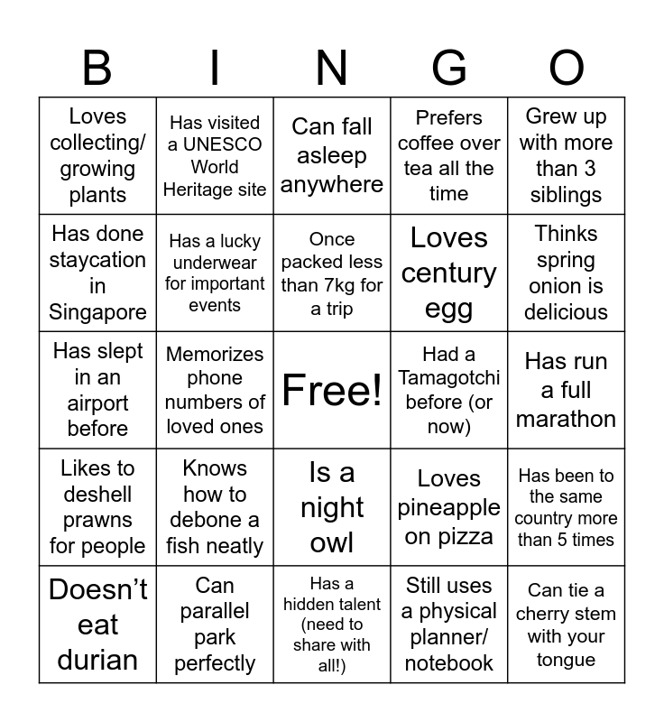 This bingo card has a free space and 24 words: Knows how to debone a fish neatly, Can parallel park perfectly, Once packed less than 7kg for a trip, Doesn’t eat durian, Grew up with more than 3 siblings, Loves collecting/ growing plants, Has done staycation in Singapore, Has visited a UNESCO World Heritage site, Had a Tamagotchi before (or now), Is a night owl, Loves century egg, Has slept in an airport before, Loves pineapple on pizza, Has been to the same country more than 5 times, Has a lucky underwear for important events, Still uses a physical planner/ notebook, Has run a full marathon, Can fall asleep anywhere, Thinks spring onion is delicious, Memorizes phone numbers of loved ones, Can tie a cherry stem with your tongue, Likes to deshell prawns for people, Prefers coffee over tea all the time and Has a hidden talent (need to share with all!).
