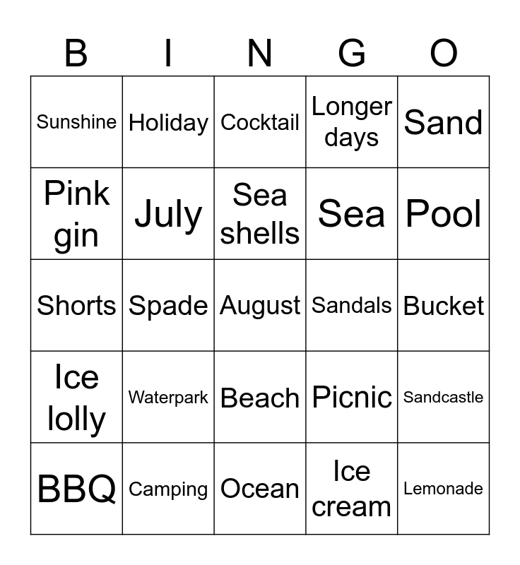 This bingo card has a free space and 24 words: Waterpark, Camping, Sea shells, BBQ, Sand, Sunshine, Pink gin, Holiday, Sandals, Beach, Sea, Shorts, Picnic, Sandcastle, July, Ice cream, Bucket, Cocktail, Pool, Spade, Lemonade, Ice lolly, Longer days and Ocean.