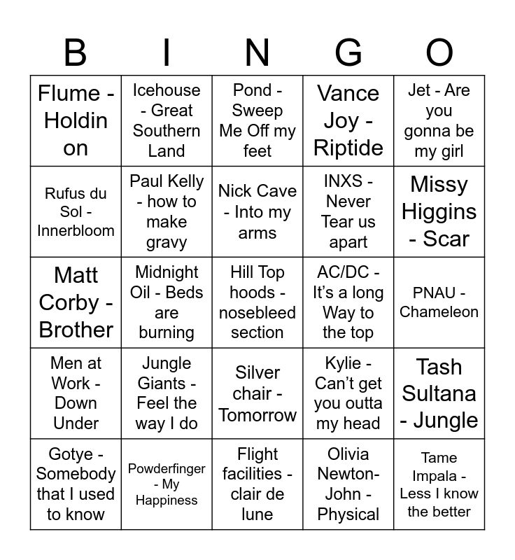 This bingo card has 27 words: Kylie - Can’t get you outta my head, Tame Impala - Less I know the better, INXS - Never Tear us apart, Flight facilities - clair de lune, Rufus du Sol - Innerbloom, Pond - Sweep Me Off my feet, Icehouse - Great Southern Land, Men at Work - Down Under, AC/DC - It’s a long Way to the top, Tash Sultana - Jungle, Matt Corby - Brother, Vance Joy - Riptide, Gotye - Somebody that I used to know, Powderfinger - My Happiness, Missy Higgins - Scar, Violet Soho - Covered in Chrome, Paul Kelly - how to make gravy, Nick Cave - Into my arms, Jungle Giants - Feel the way I do, Flume - Holdin on, PNAU - Chameleon, Olivia Newton-John - Physical, Midnight Oil - Beds are burning, Hill Top hoods - nosebleed section, Silver chair - Tomorrow, Jet - Are you gonna be my girl and Divinyls - I touch myself.