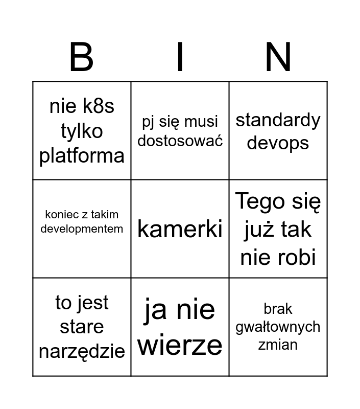 This bingo card has a free space and 8 words: Tego się już tak nie robi, standardy devops, pj się musi dostosować, to jest stare narzędzie, nie k8s tylko platforma, brak gwałtownych zmian, koniec z takim developmentem and ja nie wierze.