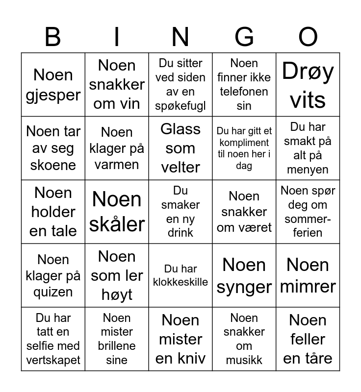 This bingo card has 25 words: Noen som ler høyt, Noen mister en kniv, Glass som velter, Du har tatt en selfie med vertskapet, Drøy vits, Noen gjesper, Noen tar av seg skoene, Noen snakker om vin, Noen snakker om været, Du har klokkeskille, Du har gitt et kompliment til noen her i dag, Noen holder en tale, Noen synger, Noen mimrer, Noen klager på varmen, Noen feller en tåre, Noen spør deg om sommer-ferien, Du sitter ved siden av en spøkefugl, Du har smakt på alt på menyen, Noen skåler, Du smaker en ny drink, Noen mister brillene sine, Noen klager på quizen, Noen finner ikke telefonen sin and Noen snakker om musikk.