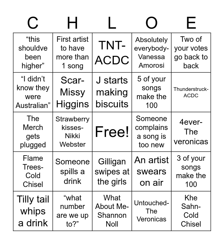 This bingo card has a free space and 24 words: Someone spills a drink, “what number are we up to?”, J starts making biscuits, Tilly tail whips a drink, Two of your votes go back to back, “this shouldve been higher”, “I didn’t know they were Australian”, First artist to have more than 1 song, Someone complains a song is too new, Gilligan swipes at the girls, 5 of your songs make the 100, The Merch gets plugged, An artist swears on air, 3 of your songs make the 100, Scar- Missy Higgins, Untouched- The Veronicas, 4ever- The veronicas, TNT- ACDC, Thunderstruck- ACDC, Strawberry kisses- Nikki Webster, Khe Sahn- Cold Chisel, Flame Trees- Cold Chisel, Absolutely everybody- Vanessa Amorosi and What About Me- Shannon Noll.