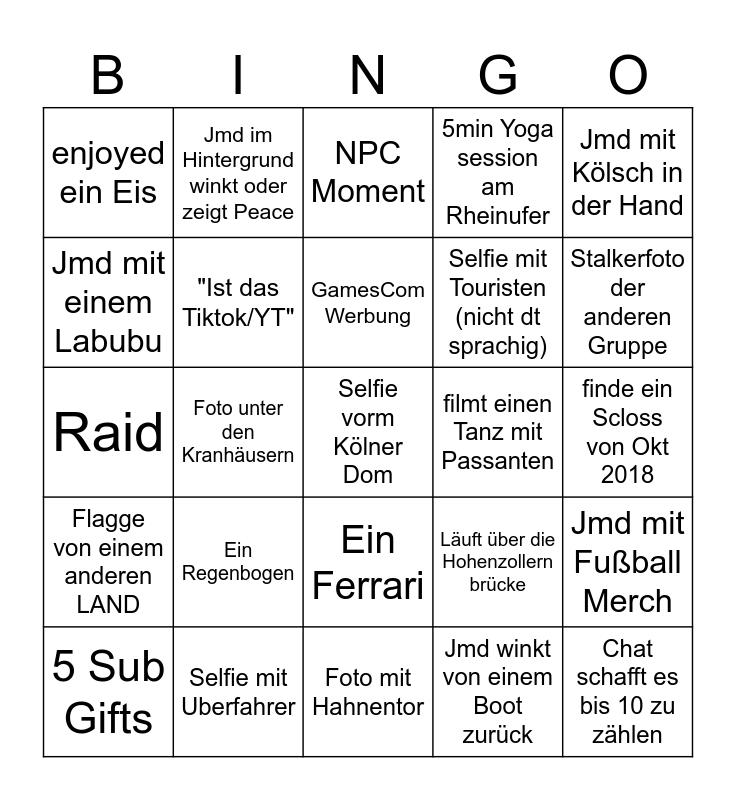 This bingo card has a free space and 24 words: Ein Regenbogen, Selfie mit Uberfahrer, GamesCom Werbung, 5 Sub Gifts, Jmd mit Kölsch in der Hand, enjoyed ein Eis, Jmd mit einem Labubu, Jmd im Hintergrund winkt oder zeigt Peace, filmt einen Tanz mit Passanten, Ein Ferrari, Selfie mit Touristen (nicht dt sprachig), Raid, Läuft über die Hohenzollern brücke, Jmd mit Fußball Merch, "Ist das Tiktok/YT", Jmd winkt von einem Boot zurück, finde ein Scloss von Okt 2018, NPC Moment, Stalkerfoto der anderen Gruppe, Foto unter den Kranhäusern, Chat schafft es bis 10 zu zählen, Flagge von einem anderen LAND, 5min Yoga session am Rheinufer and Foto mit Hahnentor.