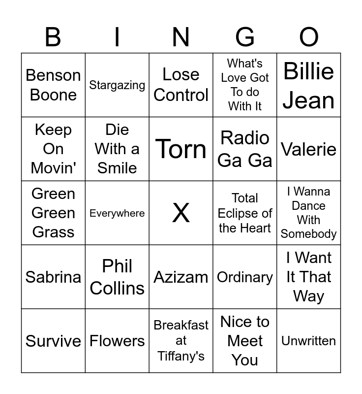 This bingo card has a free space and 24 words: Phil Collins, Flowers, Torn, Survive, Billie Jean, Benson Boone, Keep On Movin', Stargazing, Total Eclipse of the Heart, Azizam, Radio Ga Ga, Green Green Grass, Ordinary, I Want It That Way, Die With a Smile, Nice to Meet You, I Wanna Dance With Somebody, Lose Control, Valerie, Everywhere, Unwritten, Sabrina, What's Love Got To do With It and Breakfast at Tiffany's.