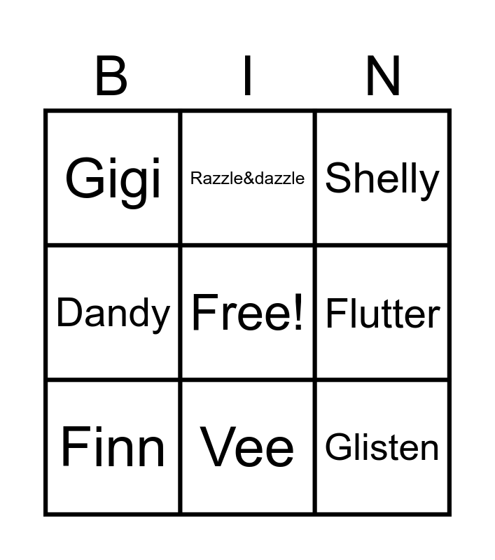 This bingo card has a free space and 9 words: Finn, Shelly, Razzle&dazzle, Dandy, Gigi, Flutter, Glisten, Brightney and Vee.