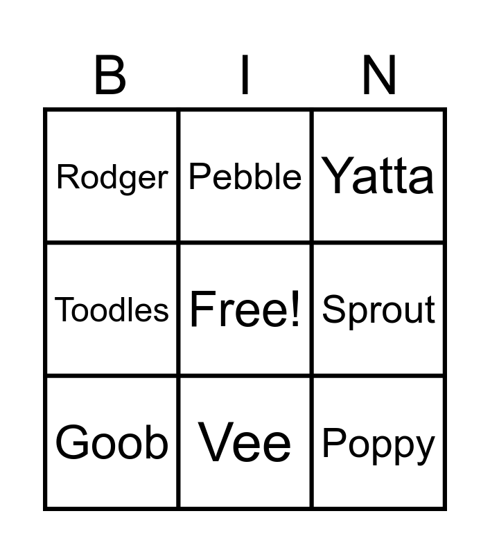 This bingo card has a free space and 9 words: Goob, Yatta, Pebble, Toodles, Rodger, Sprout, Poppy, Dandy and Vee.