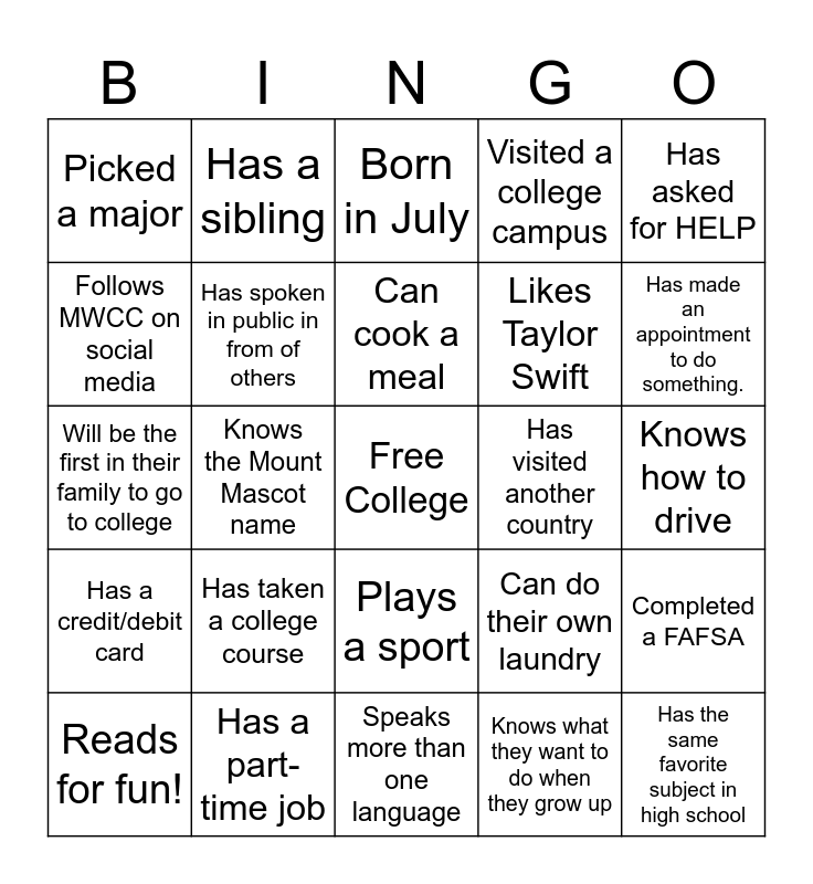 This bingo card has a free space and 24 words: Has taken a college course, Has a part-time job, Can cook a meal, Reads for fun!, Has asked for HELP, Picked a major, Follows MWCC on social media, Has a sibling, Has visited another country, Plays a sport, Likes Taylor Swift, Will be the first in their family to go to college, Can do their own laundry, Completed a FAFSA, Has spoken in public in from of others, Knows what they want to do when they grow up, Knows how to drive, Born in July, Has made an appointment to do something., Knows the Mount Mascot name, Has the same favorite subject in high school, Has a credit/debit card, Visited a college campus and Speaks more than one language.